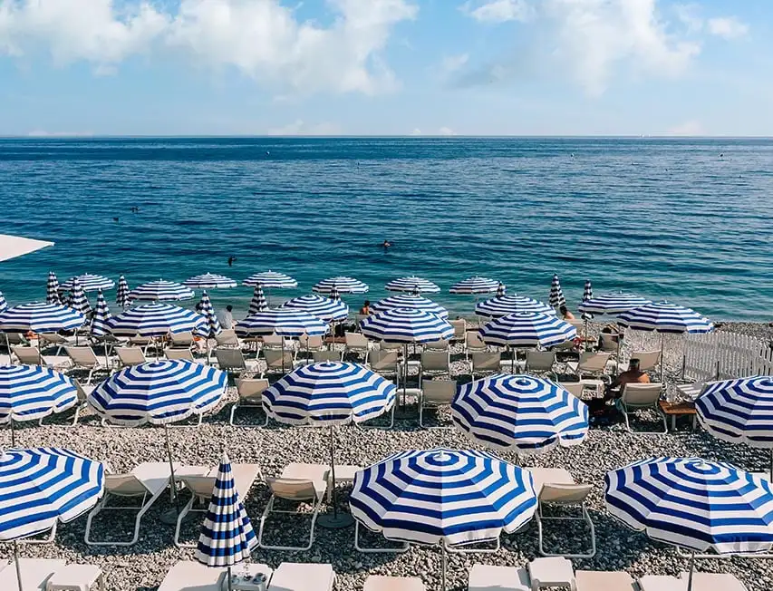 - 니스의 많은 해변 중 한 곳에서 지중해의 푸른 바다를 바라보며 휴식을 취하고 햇빛을 흡수하세요.